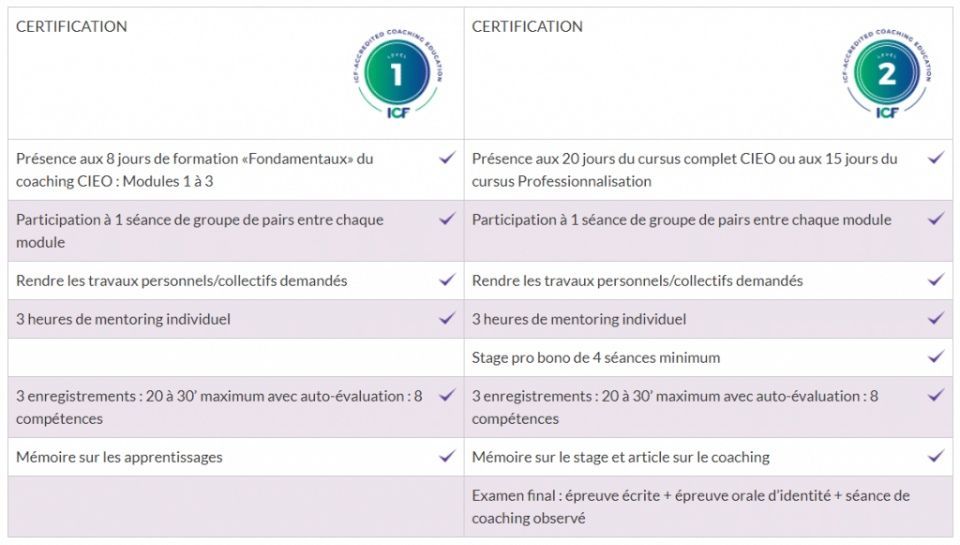 - Le Level 2 -ICF : cette certification ICF s’obtient à l’issue du cycle complet et de la réussite à l’ensemble des épreuves exigées par ICF.